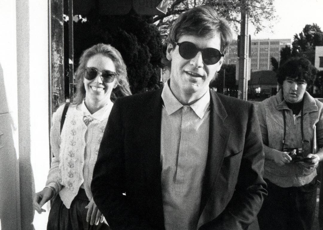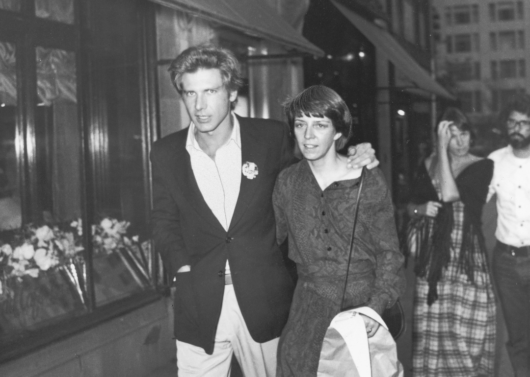 Harrison Ford and second wife, Melissa Mathison, walk down the street in sunglasses in 1983.