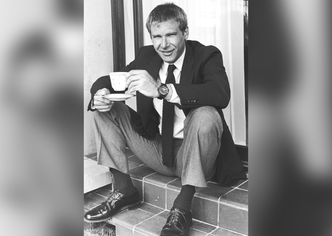 Harrison Ford sits on steps with teacup