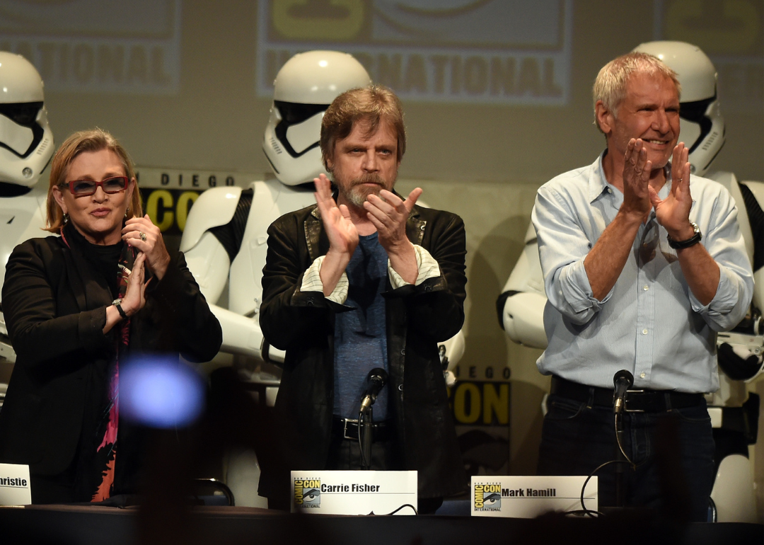Carrie Fisher, Mark Hamill and Harrison Ford applaud onstage at ComicCon