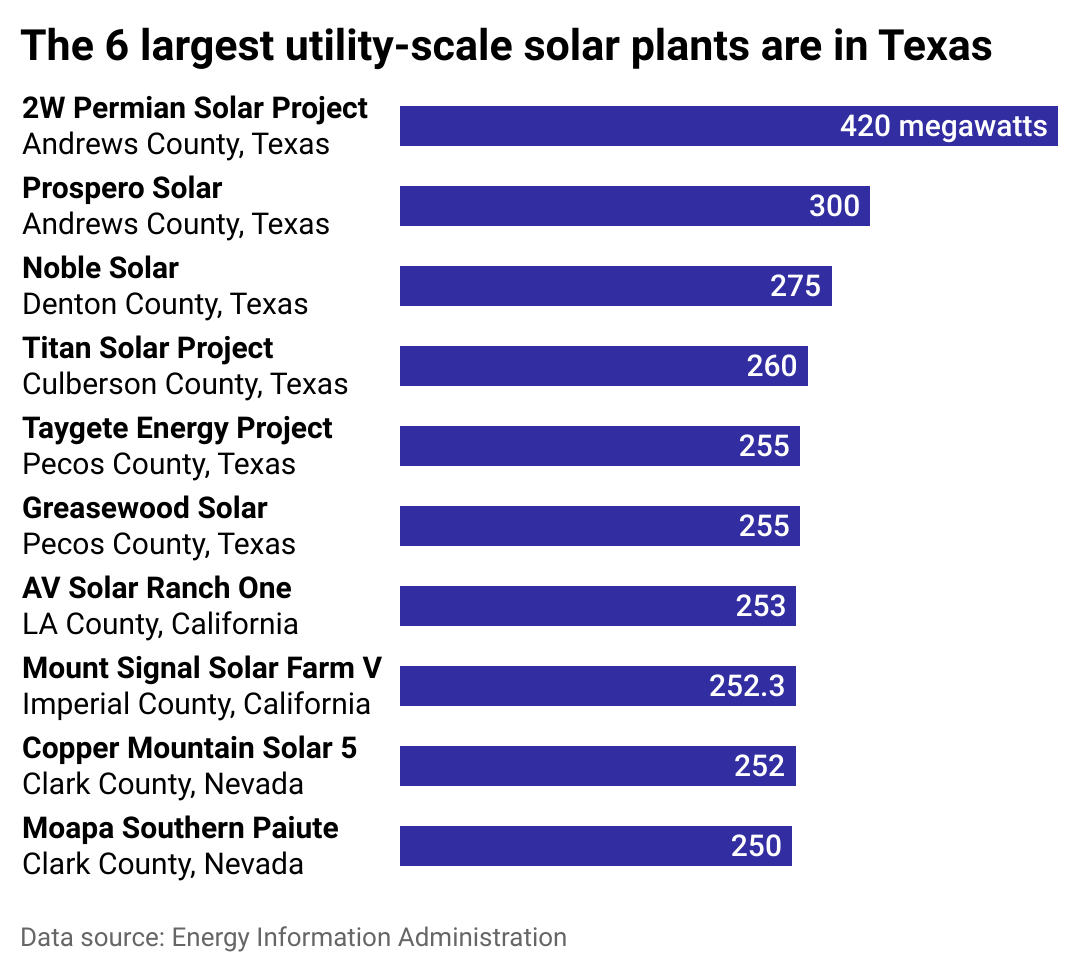 Bar chart of the 10 largest solar utlities in the U.S., all in Texas, California, and Nevada.