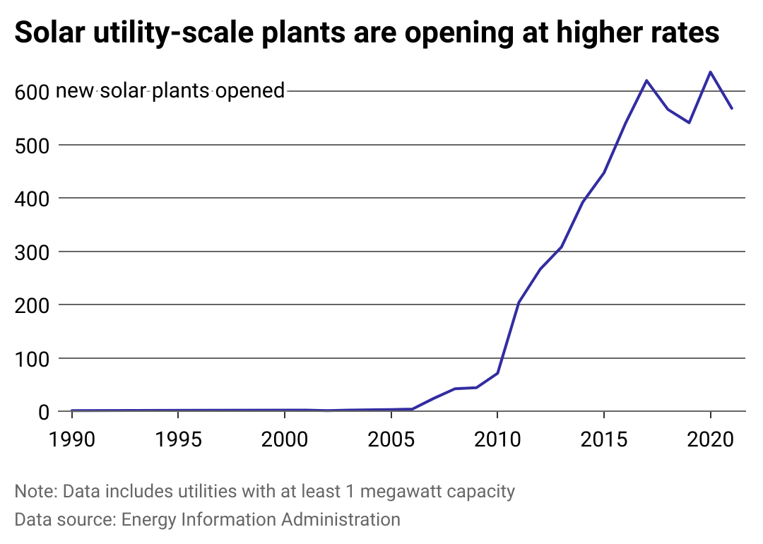 In the intervening years, solar plants have grown exponentially in both size and number. In 2010, there were little more than 100 utility-scale plants in the U.S.; as of 2020, that number grew six times larger.