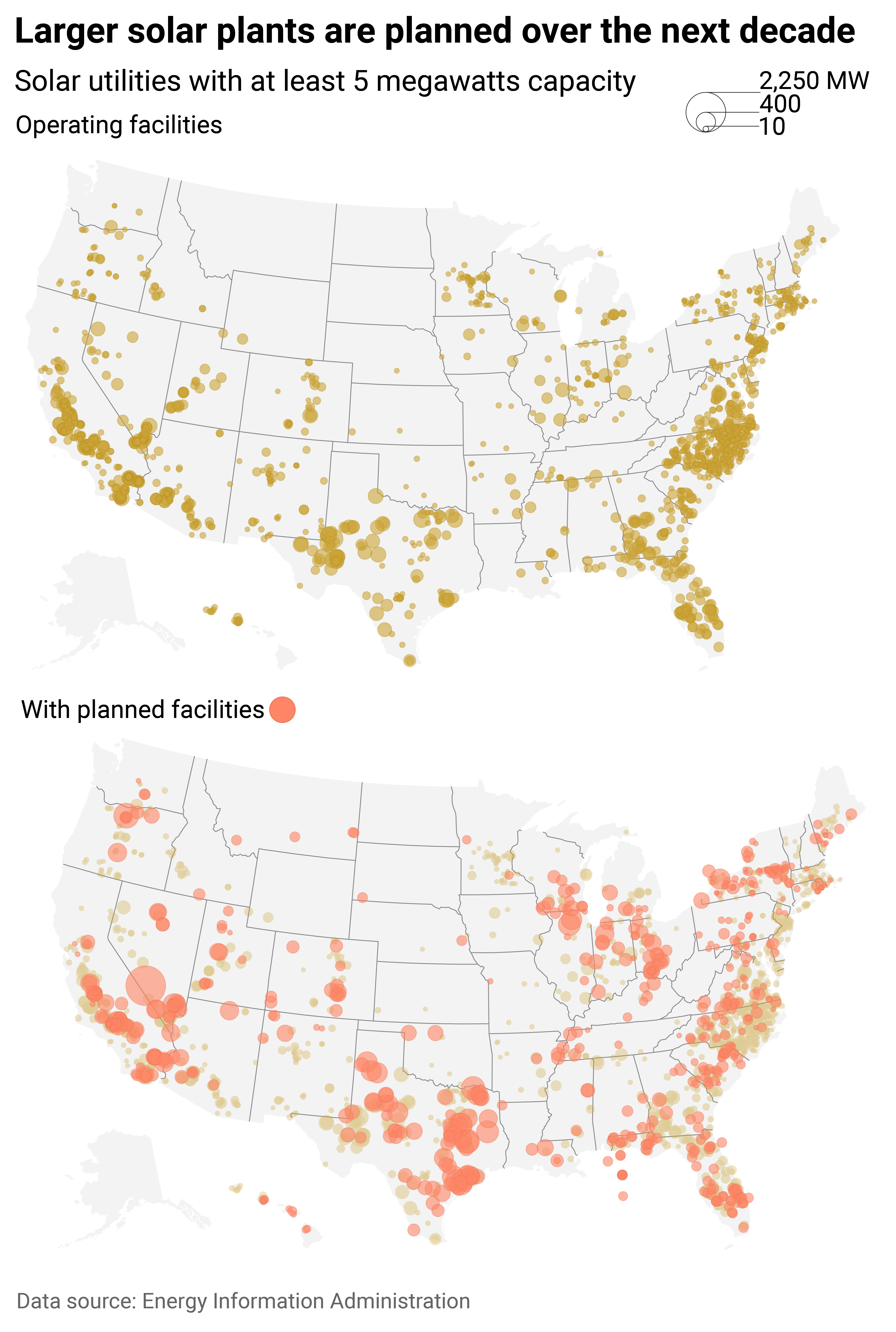 Symbol map showing solar utilities in the U.S., clustered in states like California, Texas, and along the East Coast.