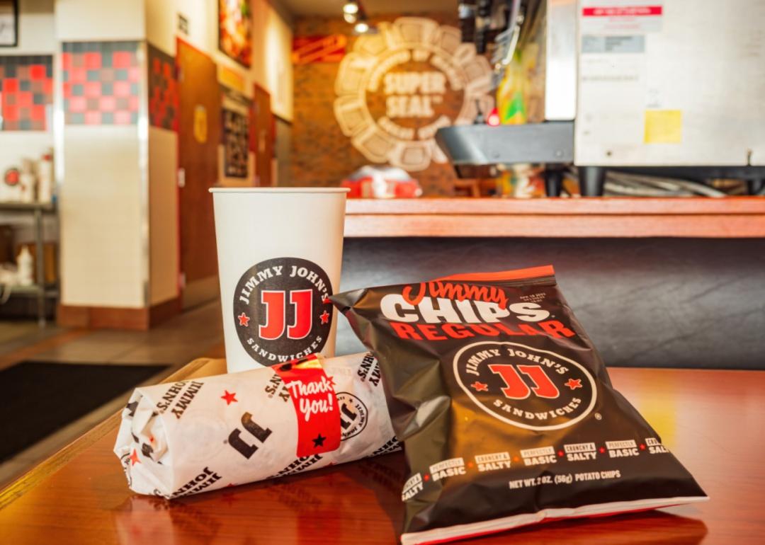 A Jimmy John’s sandwich, bag of chips, and a drink.