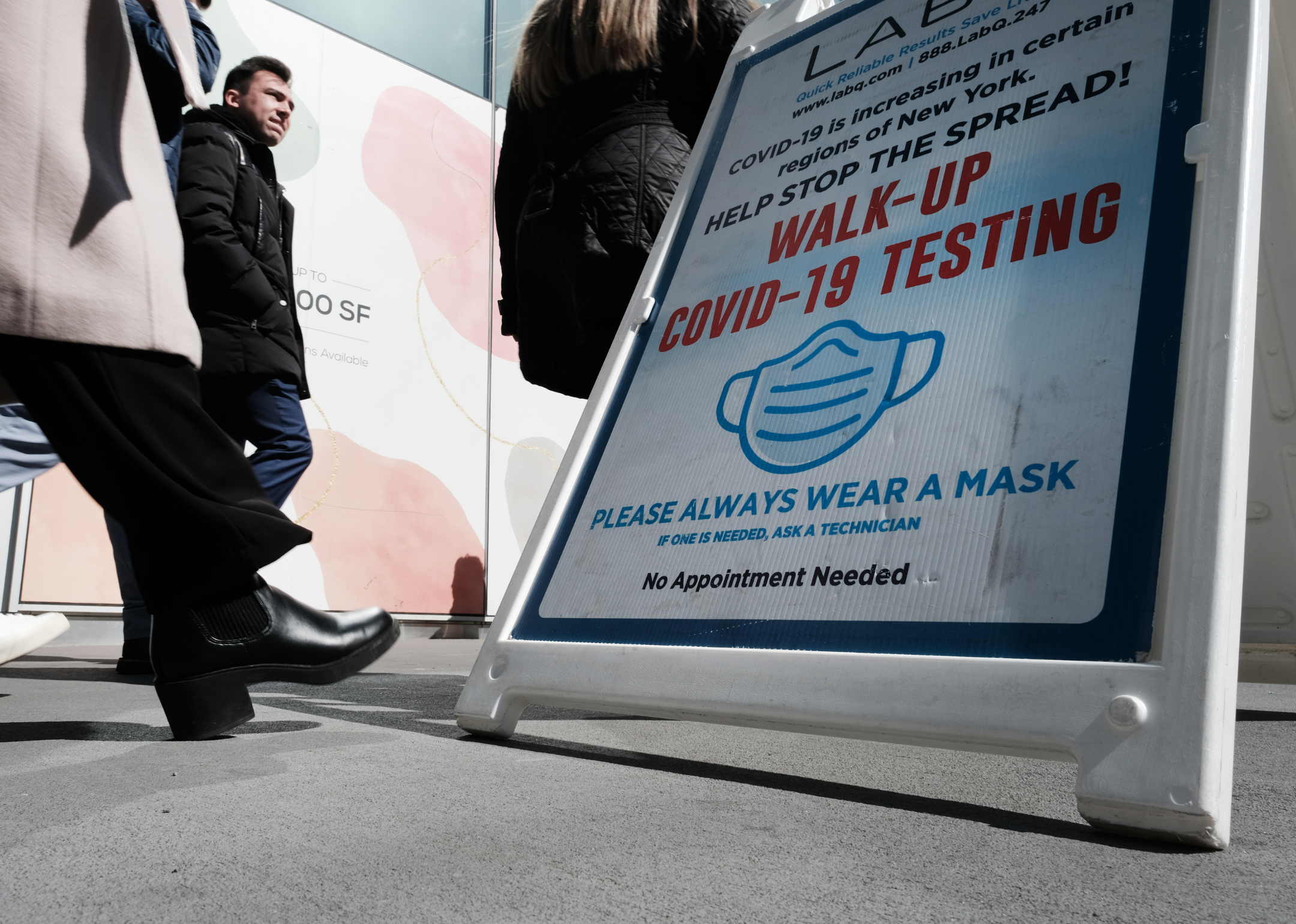 Photo shows a close up of a COVID-19 test site sign standing on a public sidewalk with people walking by.