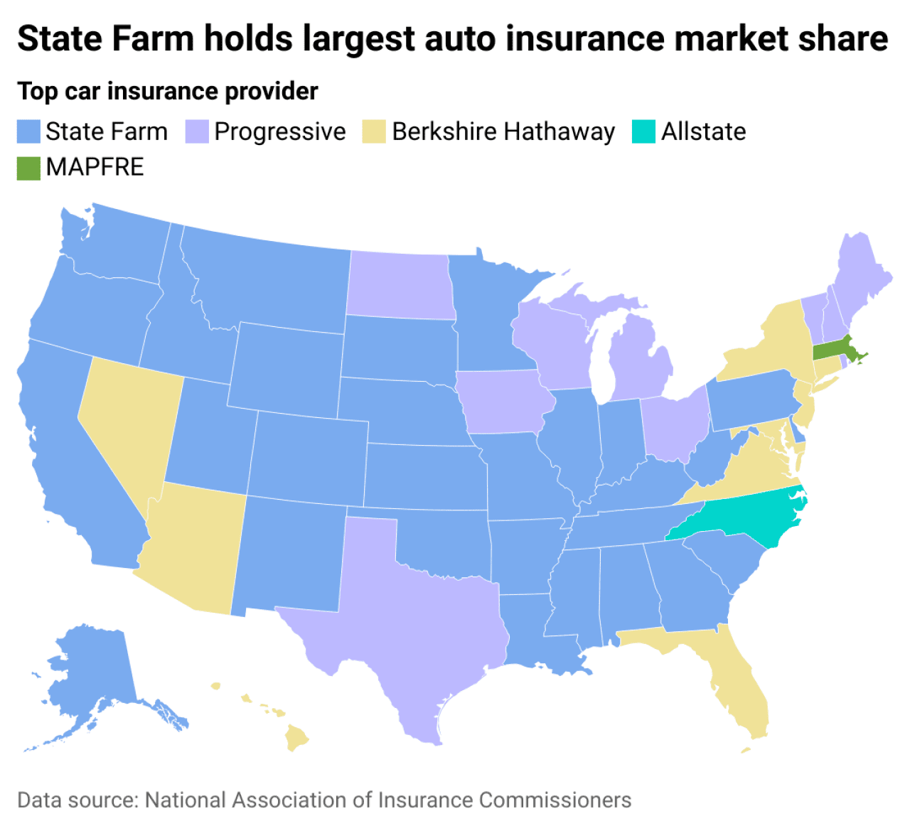 Bloomington, Illinois-based State Farm is the top car insurance provider in 29 states. Following behind is Progressive with 10 states and GEICO (owned by Berkshire Hathaway) with nine states plus the District of Columbia. Allstate and MAPFRE are each the top insurers in just one state.