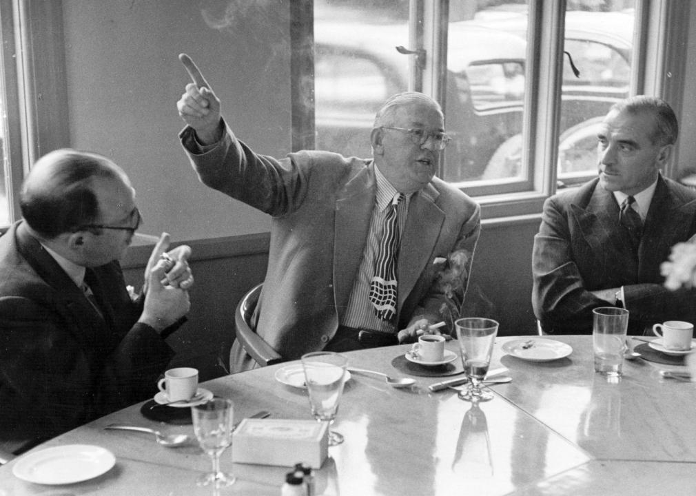 [Pictured: American Joseph Breen, Hollywood director, speaking with British director Michael Balcon and others. For many years Breen was an administrator of the Production Code, the American censorship body, governed by the “Hays Office.”]