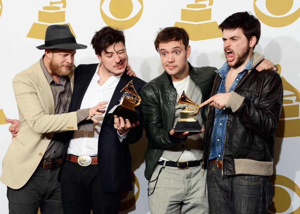 [Pictured: Musicians Ted Dwane, Marcus Mumford, Ben Lovett and Country Winston-Marshall of Mumford & Sons at the 55th Annual Grammy Awards.]