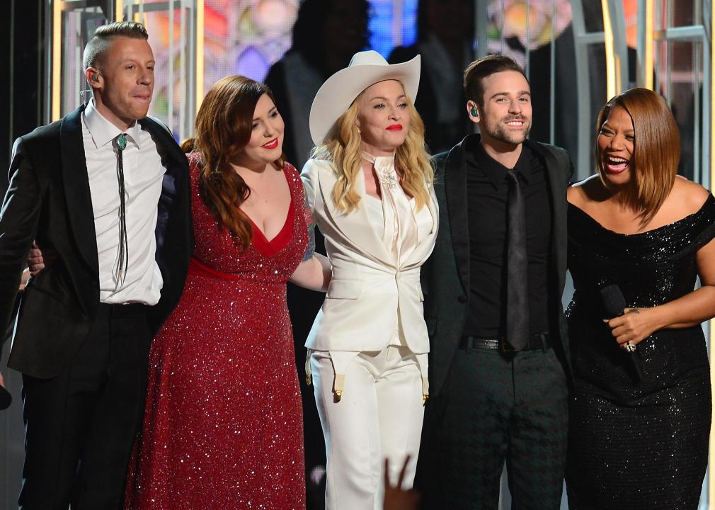 [Pictured: Macklemore, Mary Lambert, Madonna, Ryan Lewis, and Queen Latifah embrace on stage at the 56th Grammy Awards].