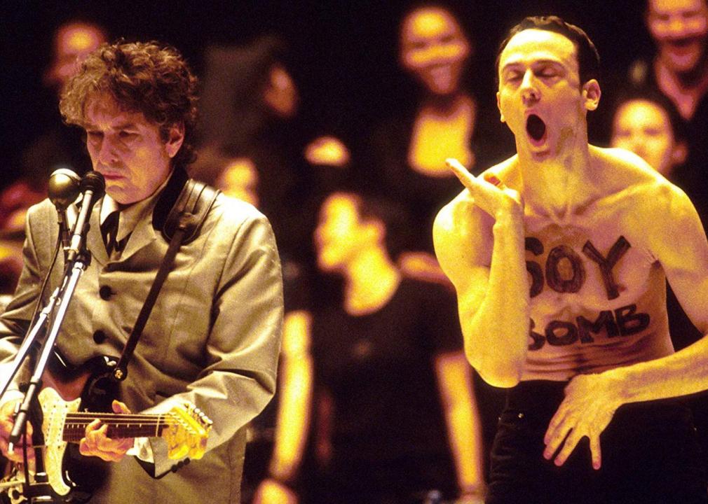 [Pictured: Bob Dylan performs “Love Sick” alongside protester/performance artist Michael Portnoy.]