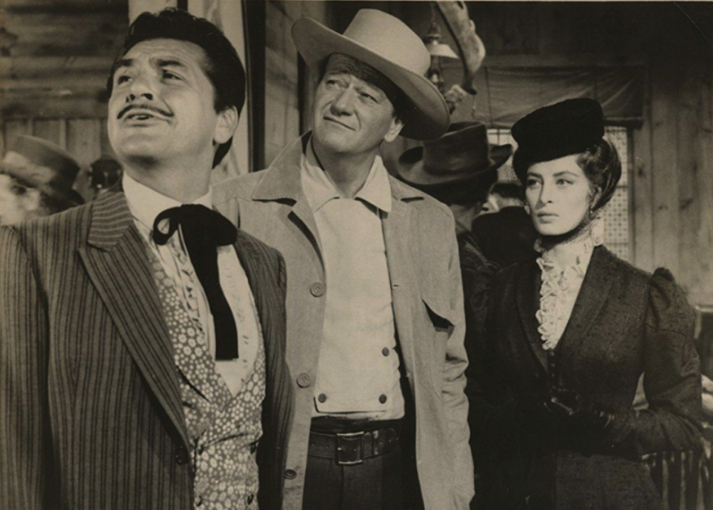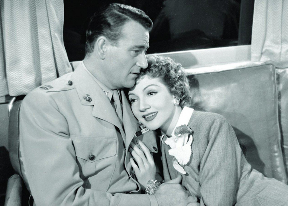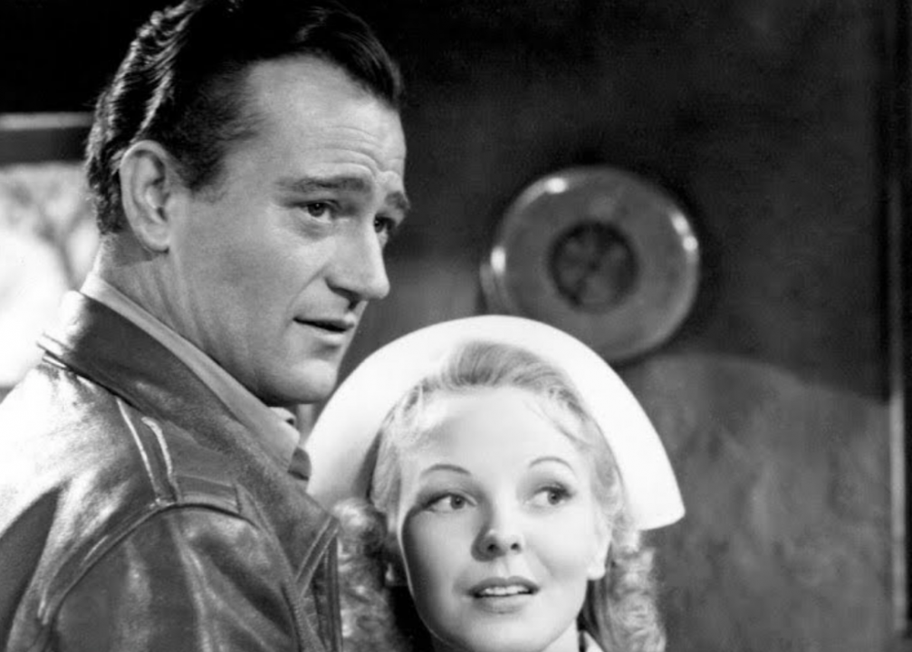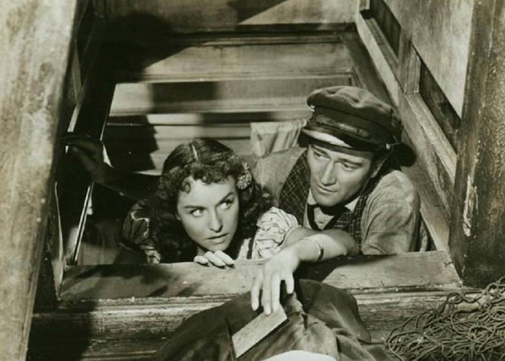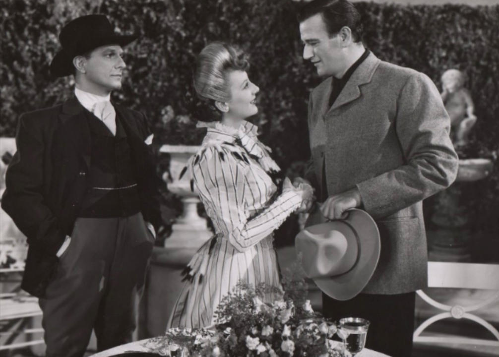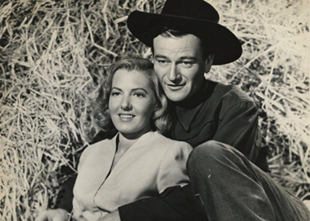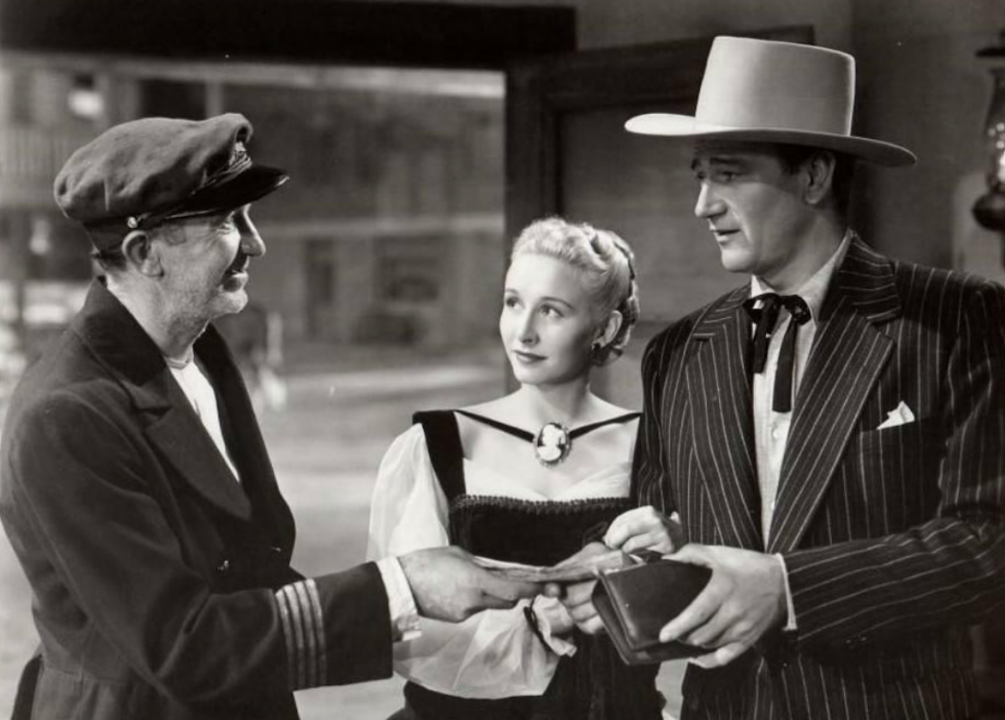 In this 1942 romance, Wayne’s character, casino-steamboat owner Jack Morgan, falls in love with his business partner, the wannabe socialite Jenny Blake. After Blake marries a man from the upper crust, Morgan pursues her anyway. Blake’s husband ends up dead from an unintentional poisoning after which Morgan swoops in.