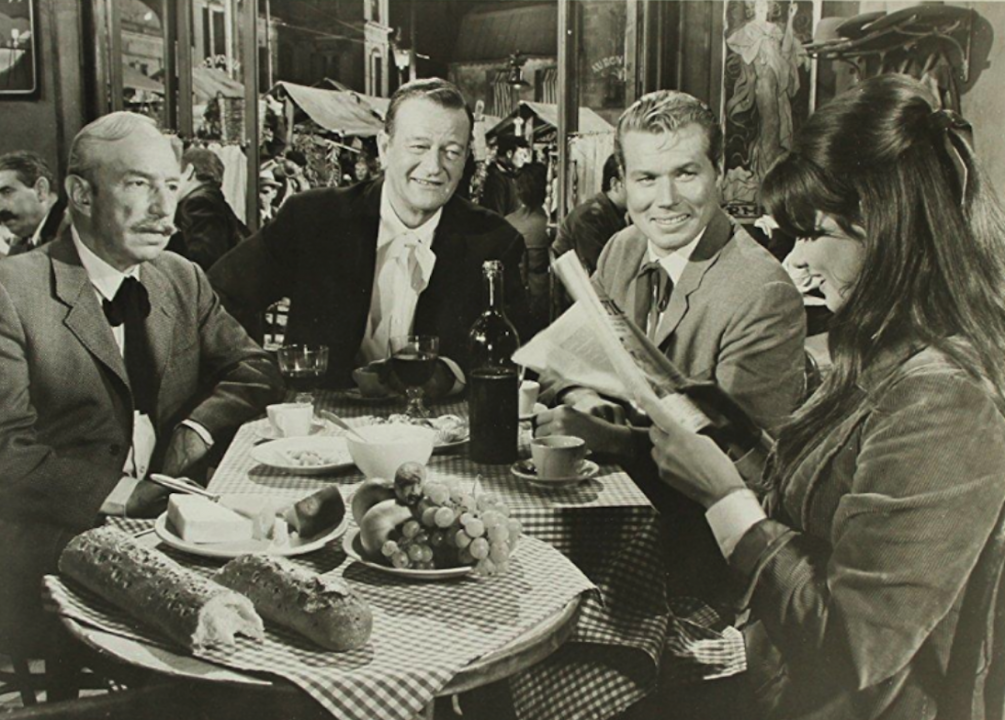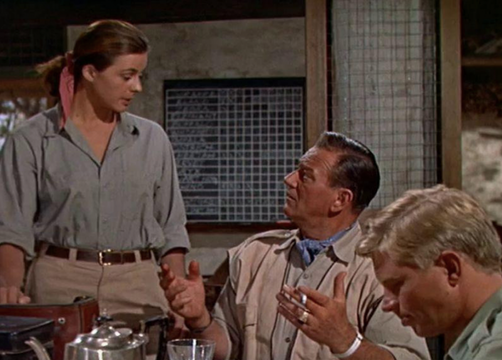 From director Howard Hawks came 1962’s “Hatari!” in which a group of men make a living by capturing African wildlife and selling it to zoos. Throwing a wrench in the operation is the arrival of a female photographer, who eventually becomes part of the gang. Filmed on location in Tanganyika, the film has Wayne and his team chasing down all sorts of real-life wild animals, often at the expense of a discernible narrative.