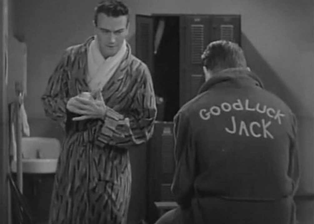 Just a year after the release of “Conflict” came the similarly premised “Idol of the Crowds.” Wayne plays Johnny Hanson, a hockey player trying to raise enough money to expand his chicken farm. Hanson finds himself being targeted by vicious gangsters after refusing to throw an important championship game.