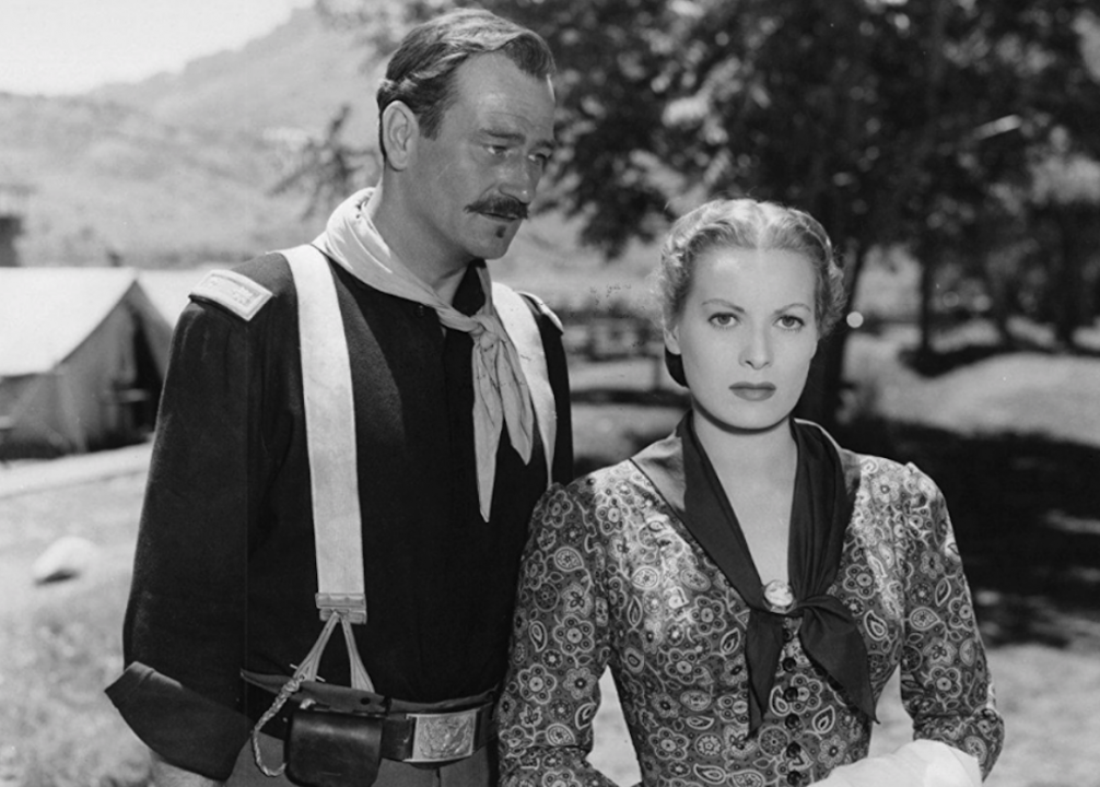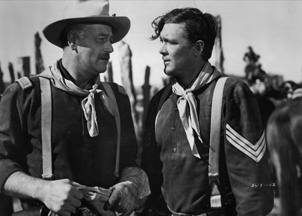 “Fort Apache” is the first film in John Ford’s cavalry trilogy. The film stars Henry Fonda as a demoted Civil War general assigned to a remote outpost deep in Apache territory. Once there, he disrespects the local tribe and butts heads with his second-in-command, Captain Kirby York, an Apache expert played by Wayne.