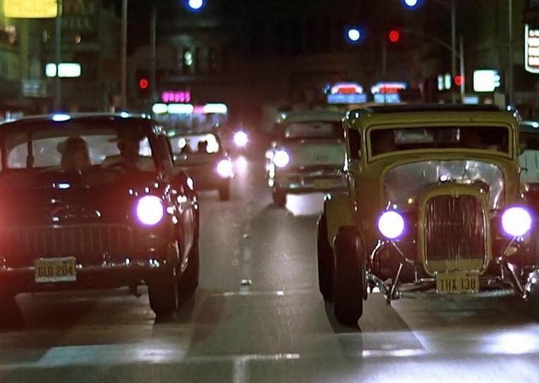 In a California town, a group of teens cruise the strip on the night of their high school graduation. As night fades, the gang gathers to watch a local against an out-of-towner as John Milner (Paul Le Mat) races Bob Falfa (Harrison Ford) on Paradise Road. Milner’s yellow 1932 Deuce Coupe literally smokes the competition, Falfa’s black 1955 Chevrolet, which winds up veering off the road, flipping, and catching on fire. Frates Road in Petaluma, California, served as the real-life location for the race.