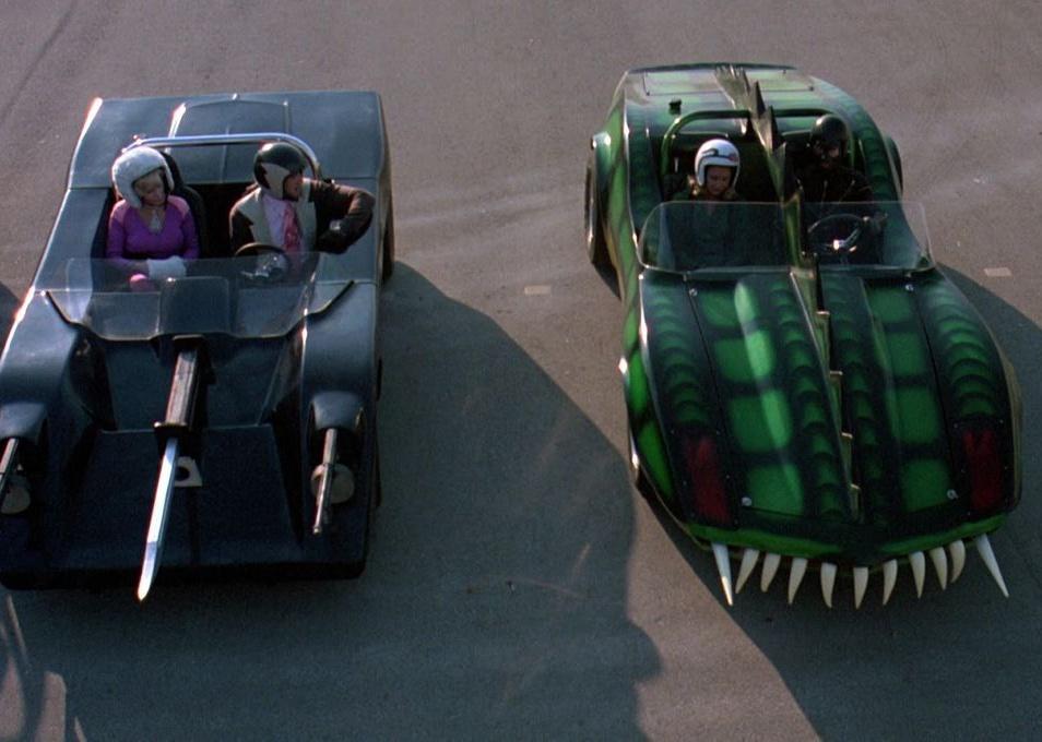 The violent Transcontinental Road Race takes place in a dystopian future where drivers compete to run down as many pedestrians as they can while gaining points for the brutality of each kill. David Carradine and Sylvester Stallone star as Frankenstein and Machine Gun Joe Viterbo. One epic race scene takes place against a desert landscape as Frankenstein drives through fiery explosions while trying to outrun a plane, which eventually explodes into the mountainside. Frankenstein’s alligator car has a row of fangs and resembles a Corvette.