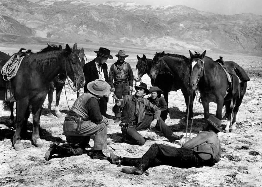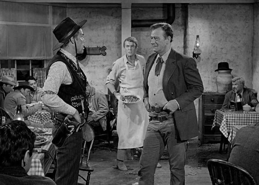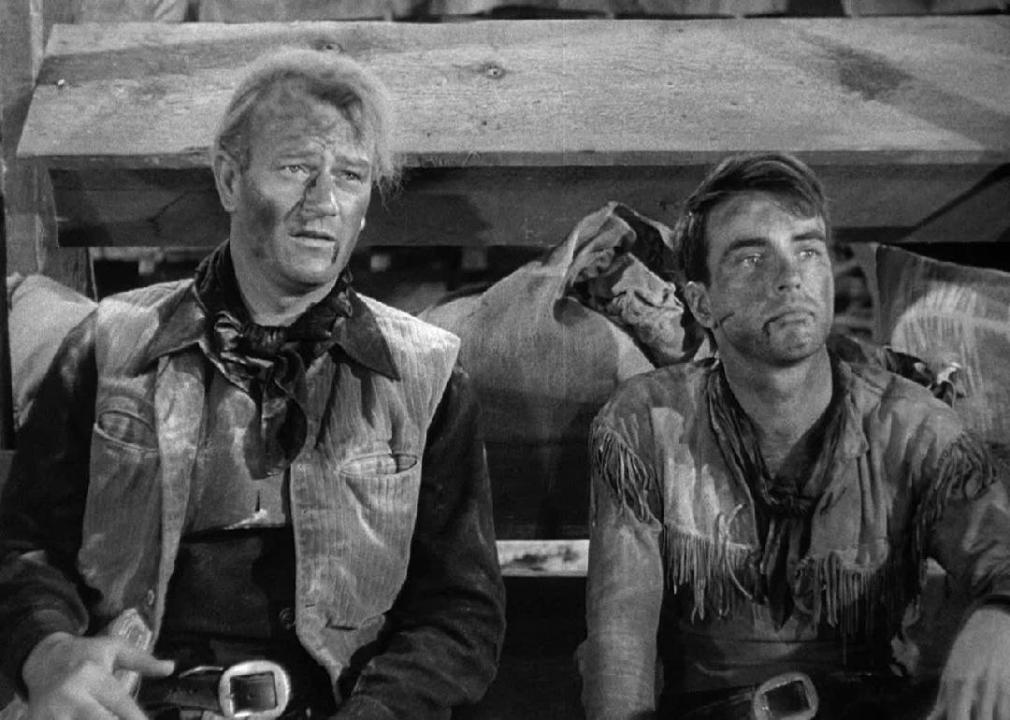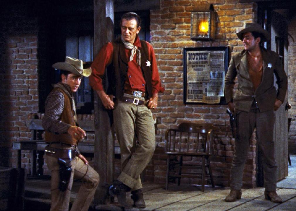 Directed by stylist Howard Hawks, the film follows three cowboys trying to maintain law and order in a world of corruption who happen to go by the iconic names Chance, Dude, and Colorado. John Wayne stars as the sheriff Chance, tasked with holding a man in jail while his corrupt and wealthy brother employs all manner of violent mayhem to bust him out. Dean Martin (Dude) aids the fight, drunk, but good-hearted, and the youngster Colorado (Ricky Nelson) also finds himself pulled into the siege.