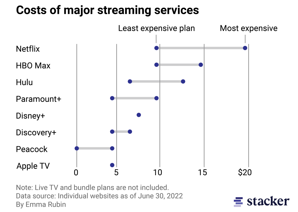 Chart showing the current prices of major streaming services, based on the end of June 2022