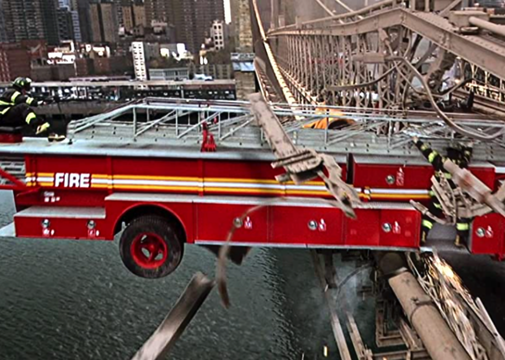 A simulated fire engine crash on a replica of Brooklyn Bridge from “Fantastic Four”