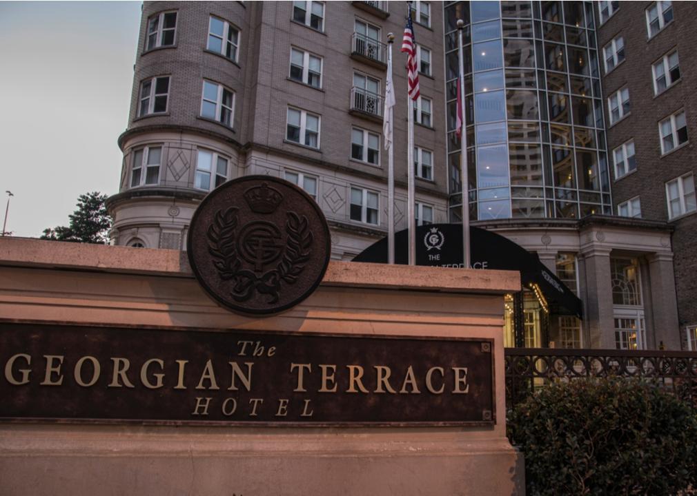 The Georgian Terrace hotel entrance sign and building at dusk.