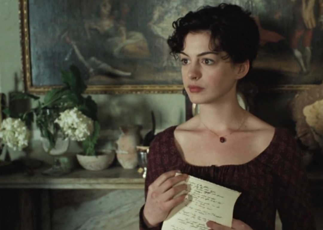 Anne Hathaway plays Jane Austen herself in “Becoming Jane,” which follows the young writer as she falls for a penniless lawyer (James McAvoy) and embarks on a love affair that will inform her future novels. According to screenwriter Kevin Hood, the creative team attempted to bring “what we know about Austen’s world from her books and letters” to the screen. The film received mixed reviews, with The New York Times’ Stephen Holden writing that “it lapses into modern romance-novel fantasy,” which “threatens to derail the film.”