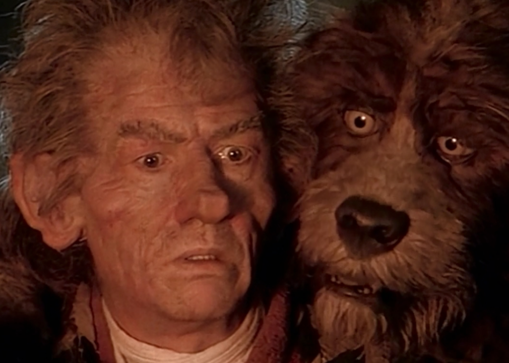 John Hurt with Brian Henson in dog costume in a scene from ‘The Storyteller.’