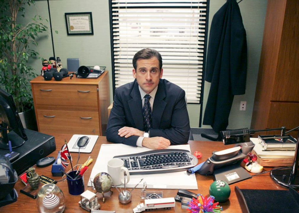 Steve Carell seated at desk in a publicity still for ‘The Office.’