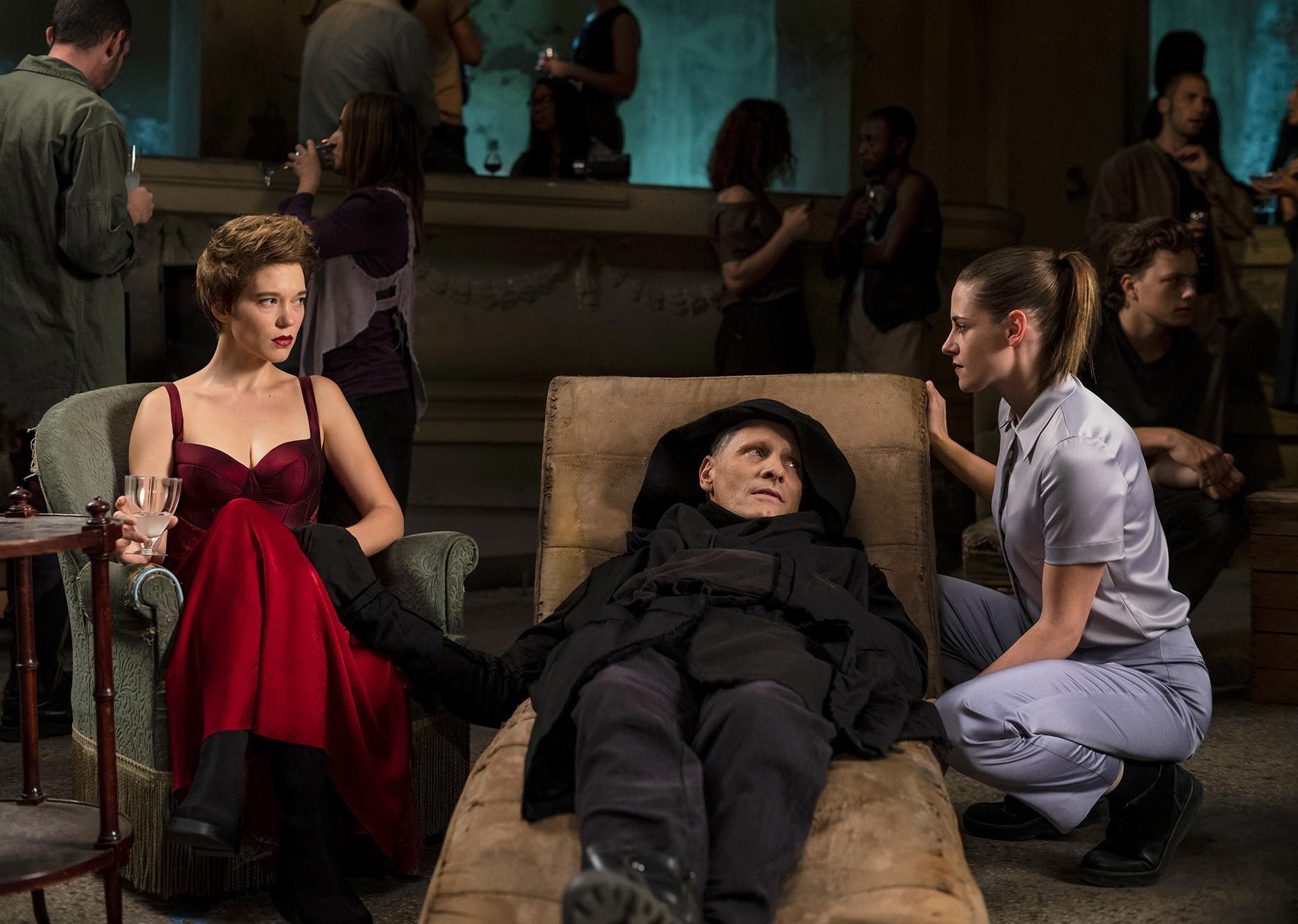 Viggo Mortensen lying on a lounge chair in a black straightjacket with Kristen Stewart and Léa Seydoux dressed up next to him