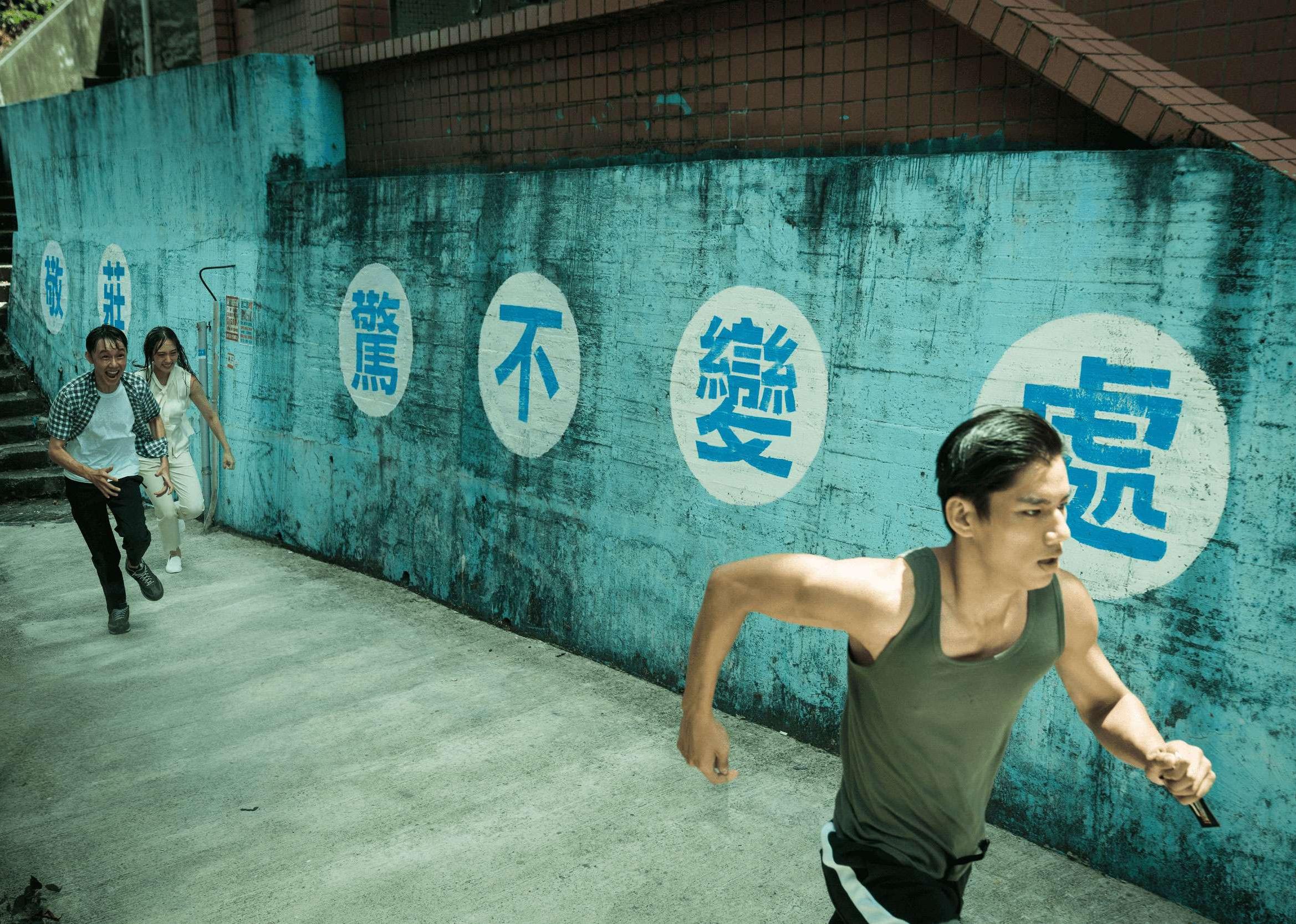 Three people running scared in front of a turquoise wall