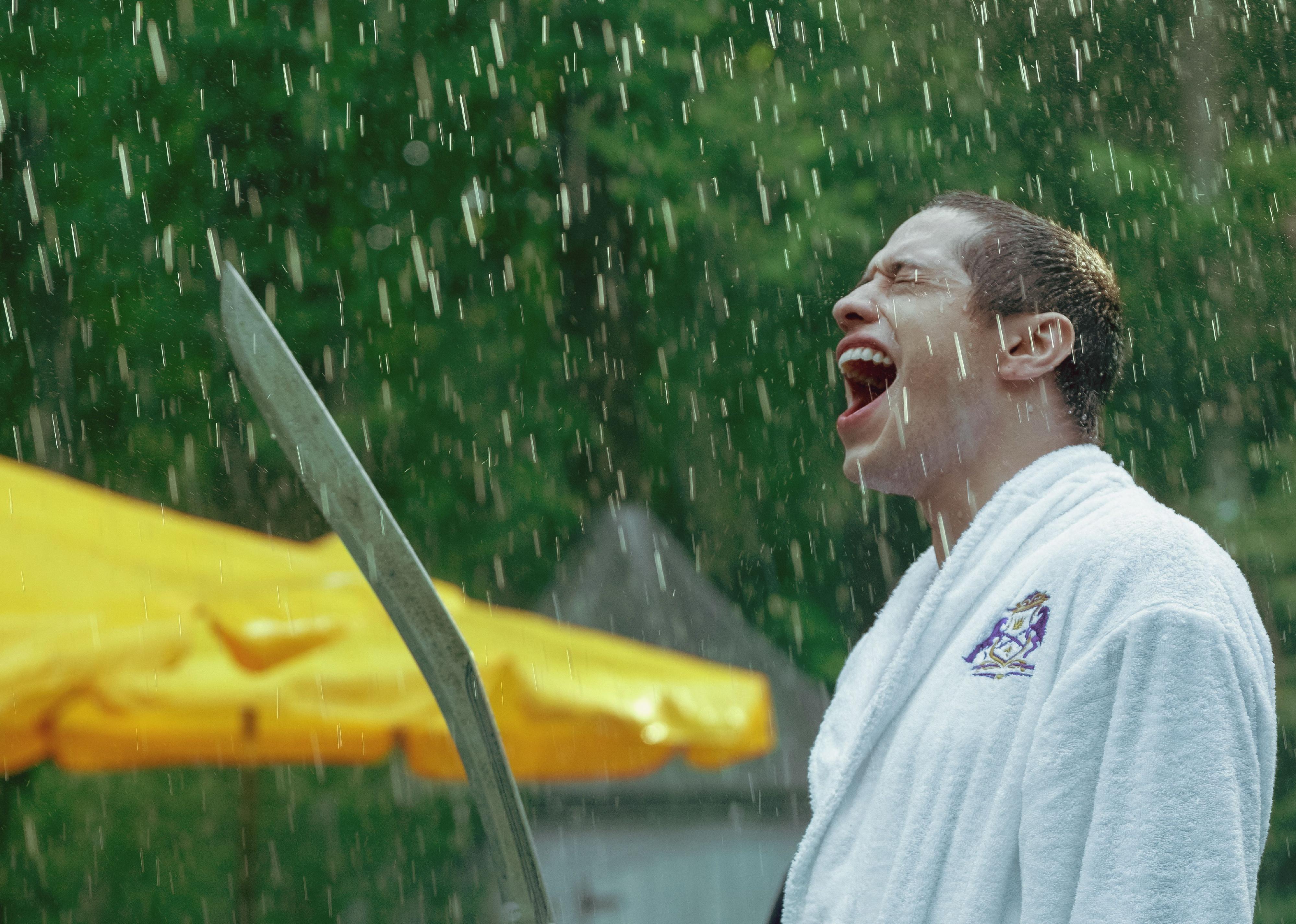 Pete Davidson wearing a robe in the rain while screaming and holding a saber