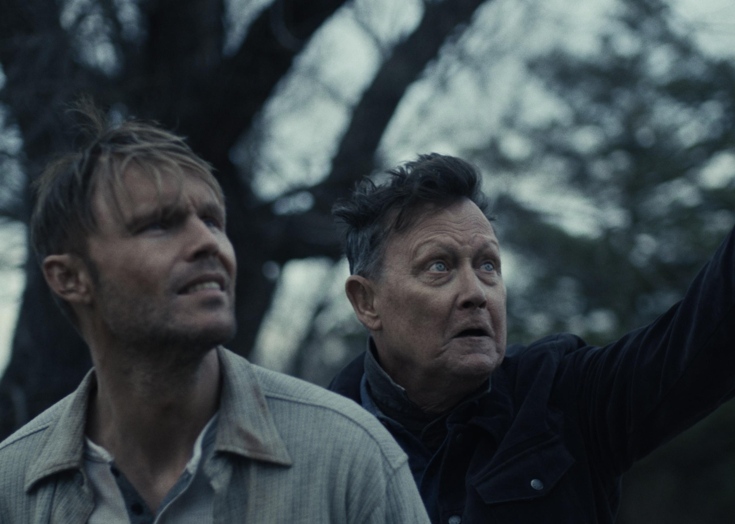 Two men looking up at the sky, one of them pointing at something