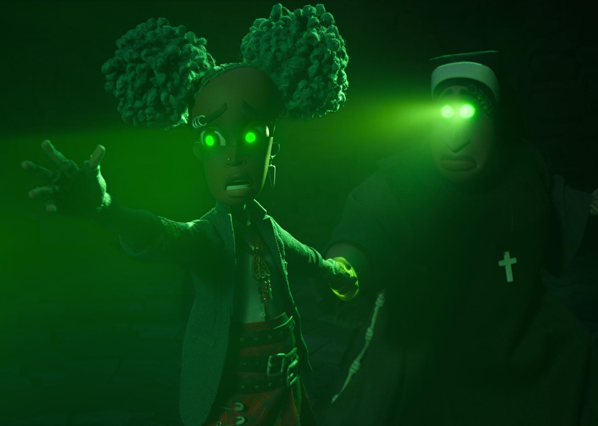 A cartoon of a young girl in a green light with eyes shining green going towards something as she is held back by a nun
