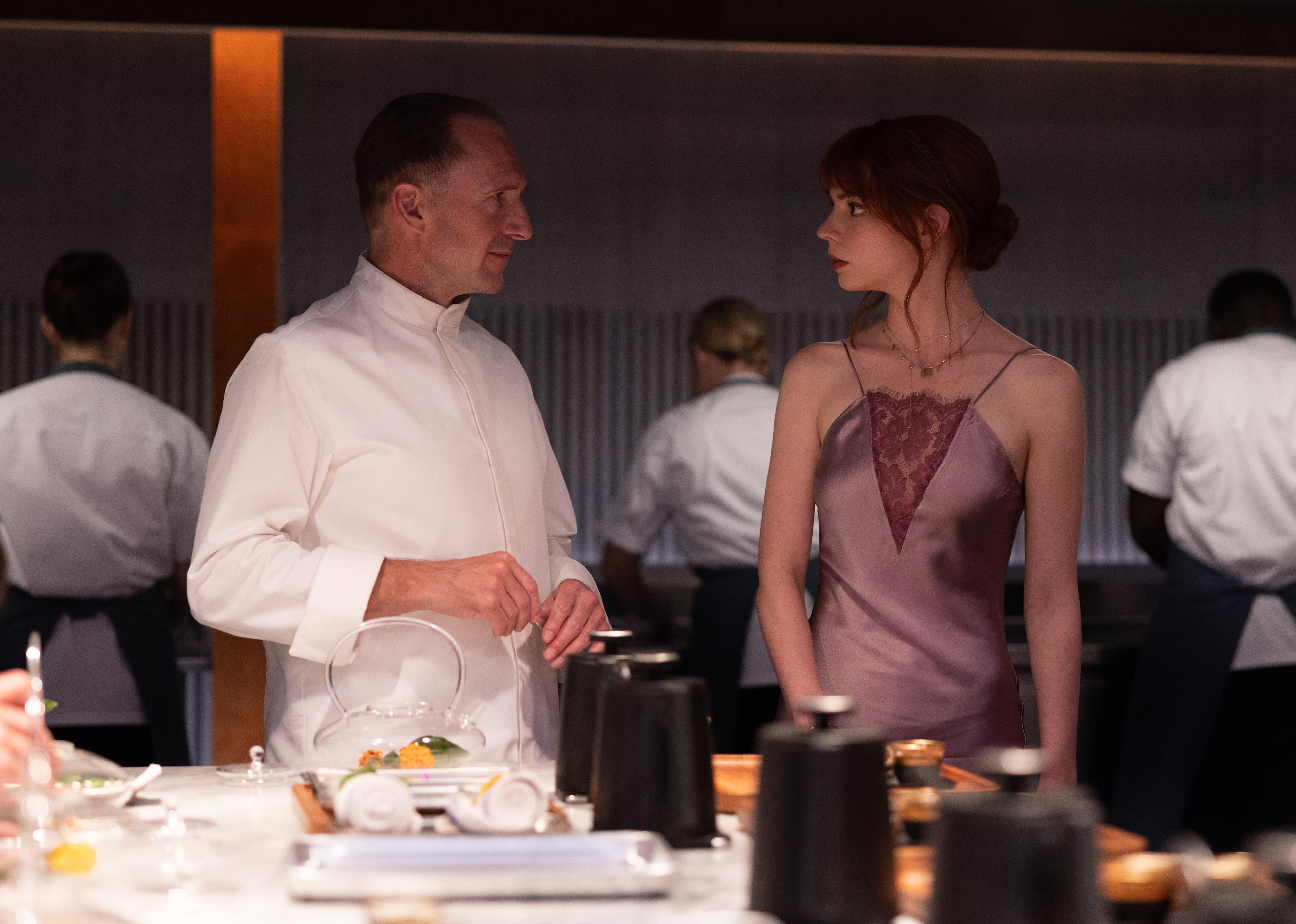 Ralph Fiennes as a chef talking to Anya Taylor-Joy in a silk gown at a party