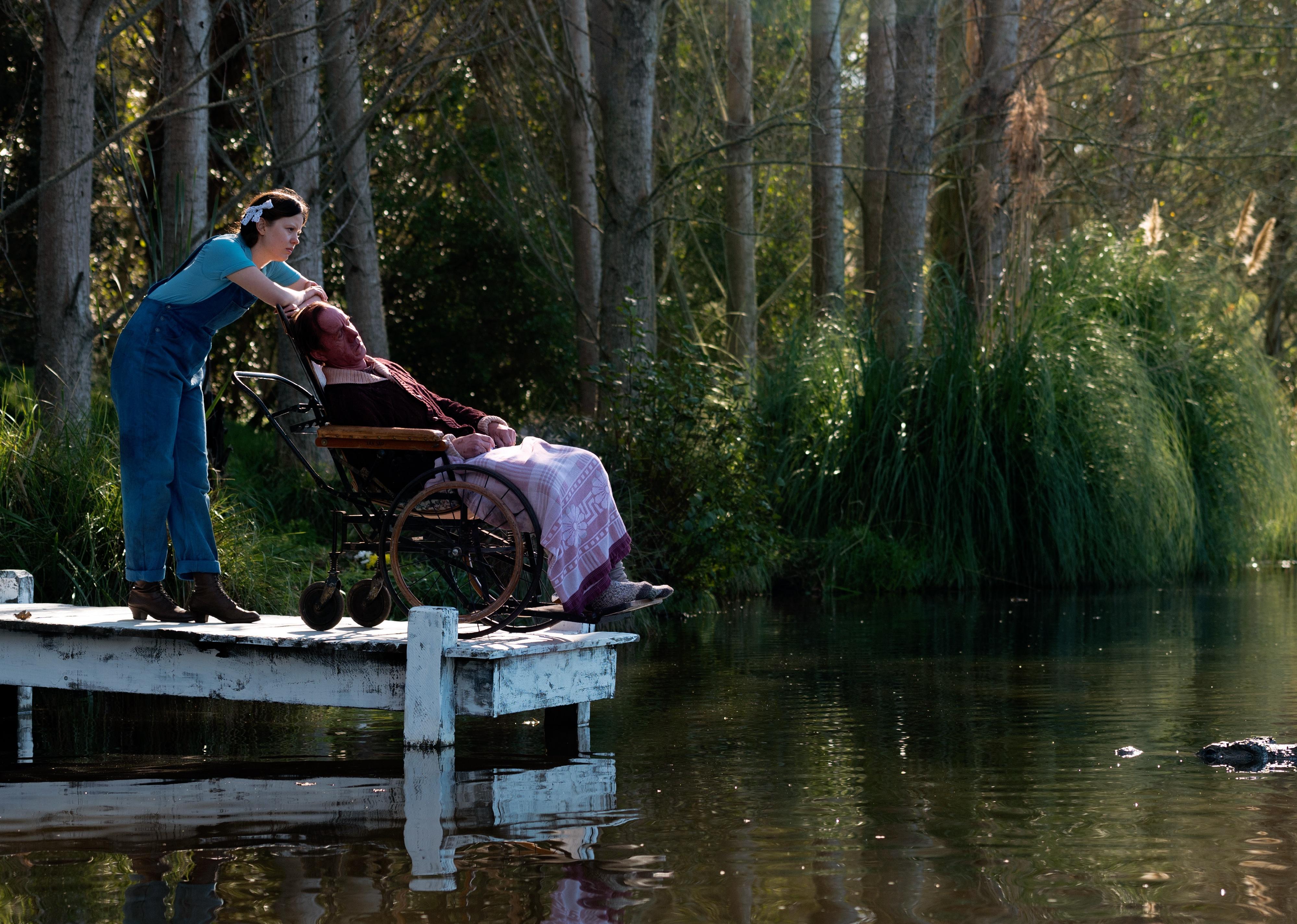 A young woman in overalls standing on a dock with a man in a wheelchair