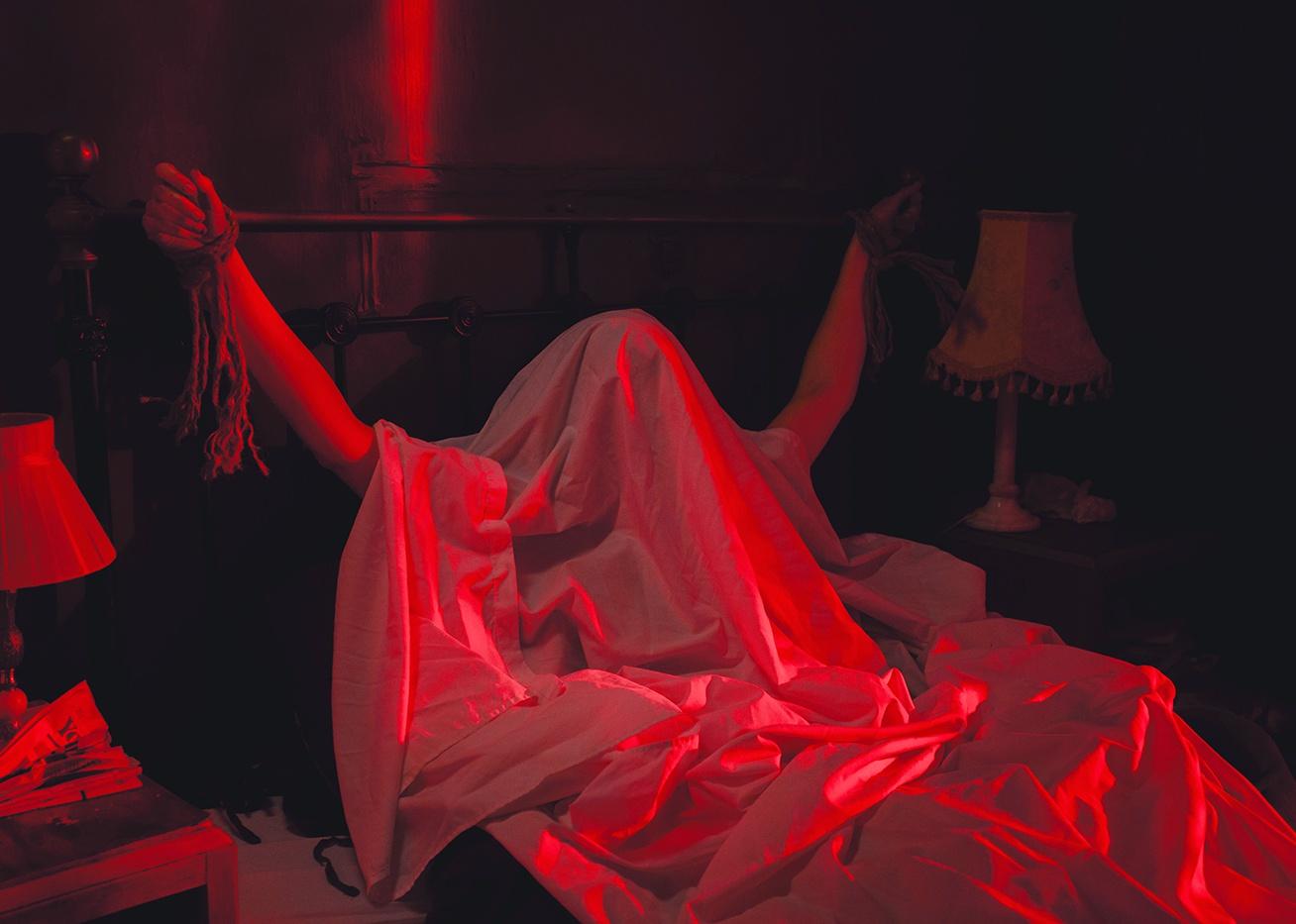 A person under a sheet tied to a bed in a red light