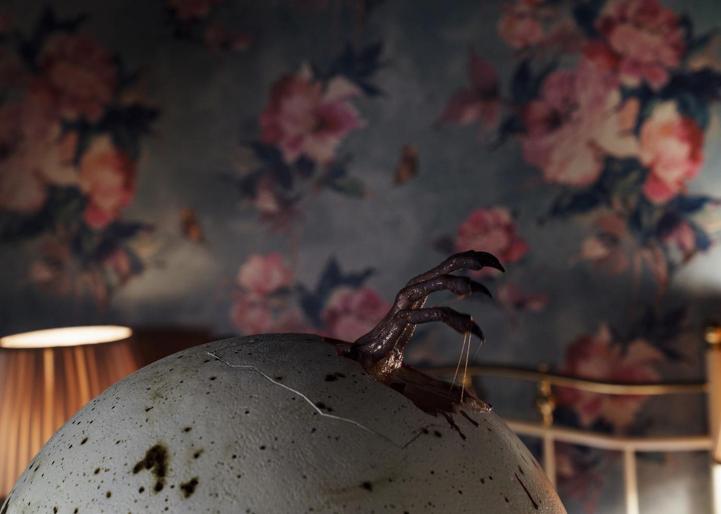 A creature hand coming out of an egg with floral wallpaper in the background