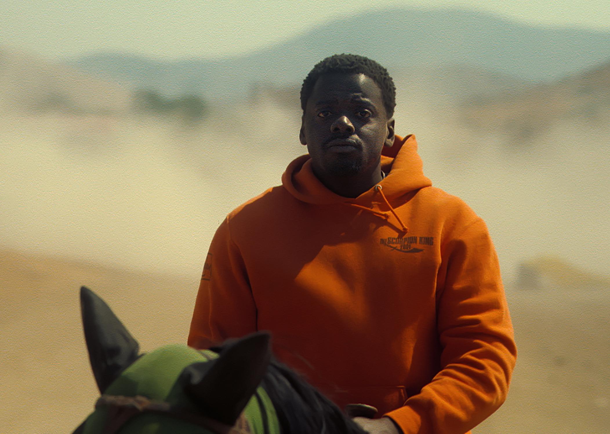Daniel Kaluuya riding a horse in an orange hoodie