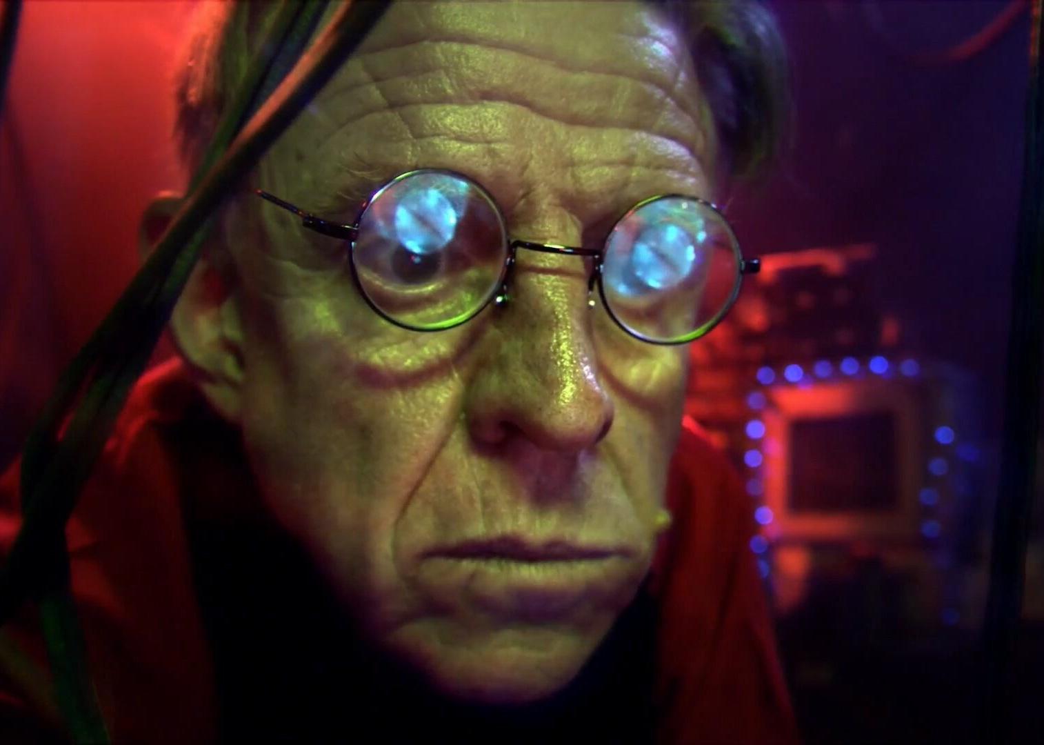An old man wearing round glasses looks closely at something