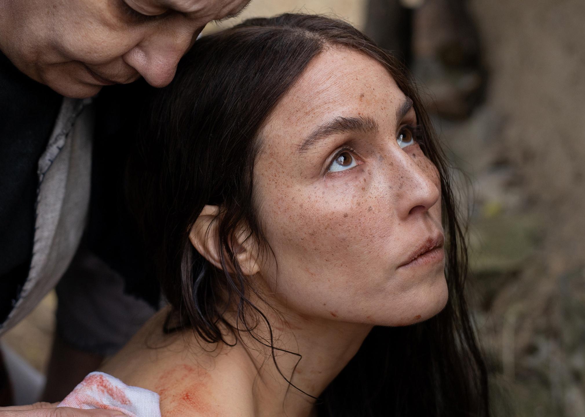 A woman with dark hair and freckles looks up while an older woman wipes blood off her shoulder