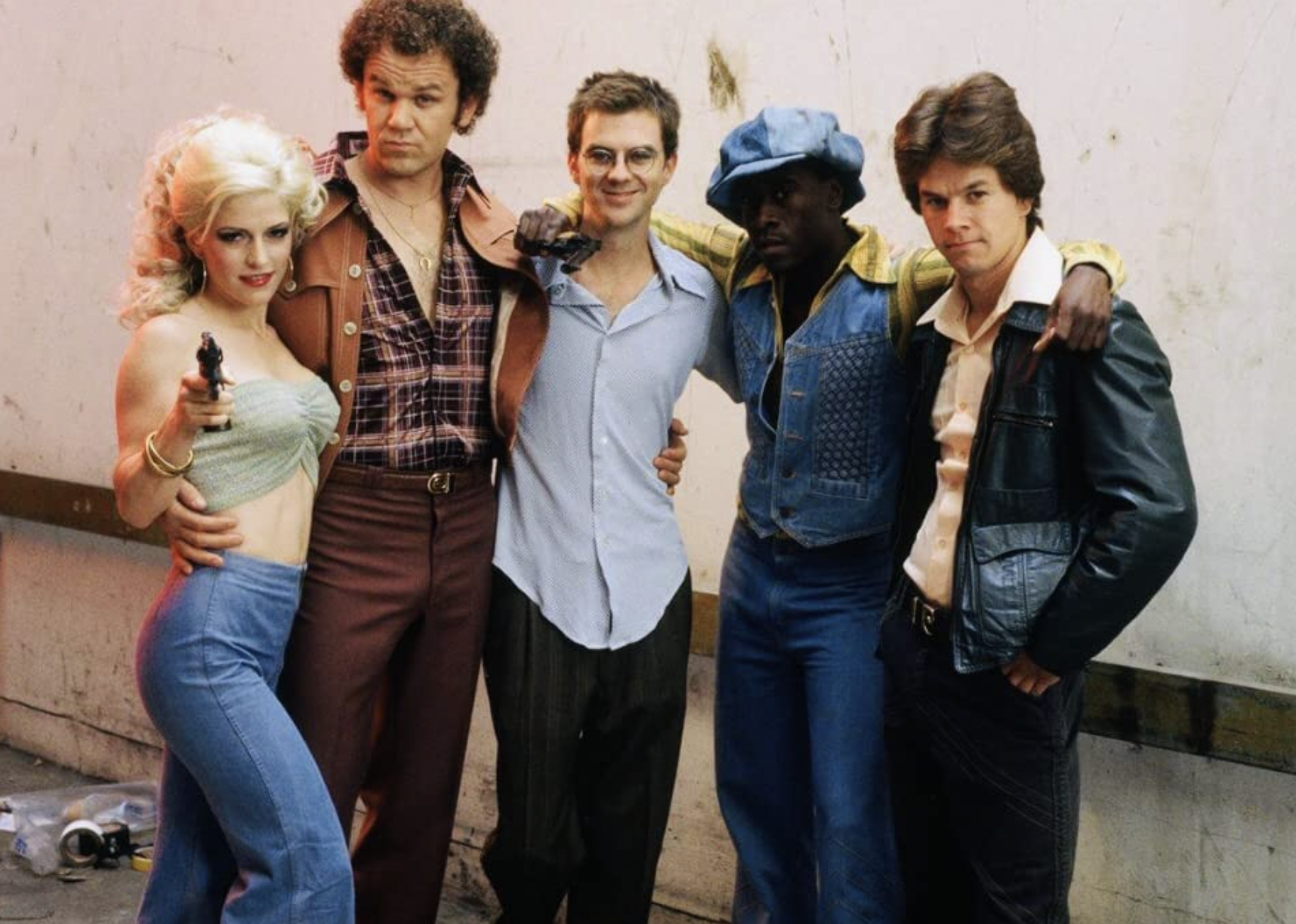 Mark Wahlberg, Don Cheadle, John C. Reilly, Paul Thomas Anderson, and Melora Walters in “Boogie Nights”
