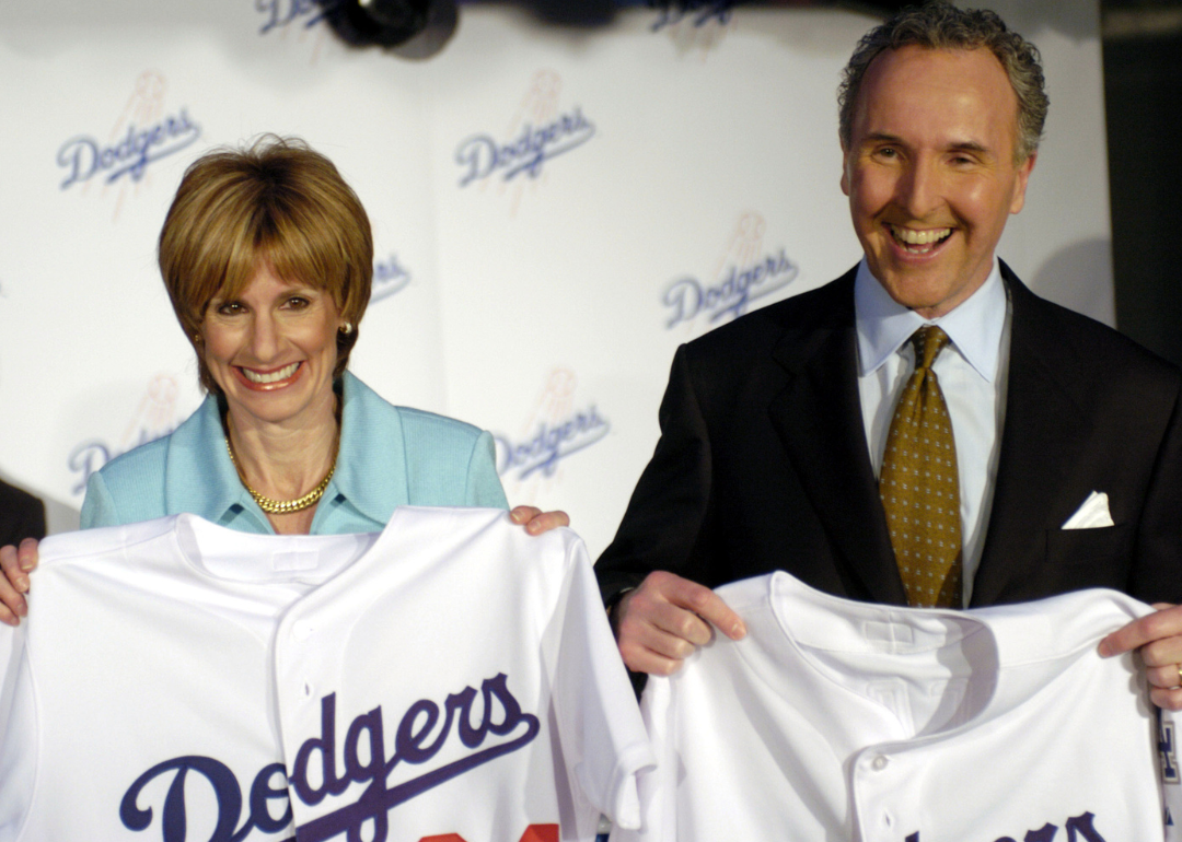 Frank McCourt and Jamie Luskin hold Dodgers jerseys at a press conference