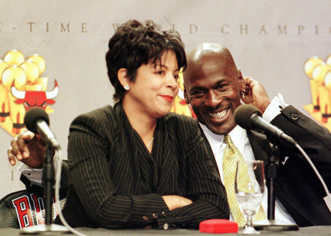 Michael Jordan and Juanita Vanoy sit together a press conference