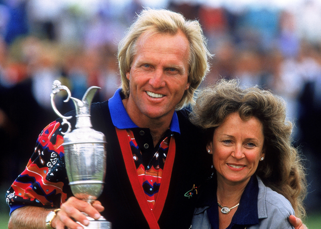 Greg Norman of Australia celebrates with his wife Laura after winning the British Open