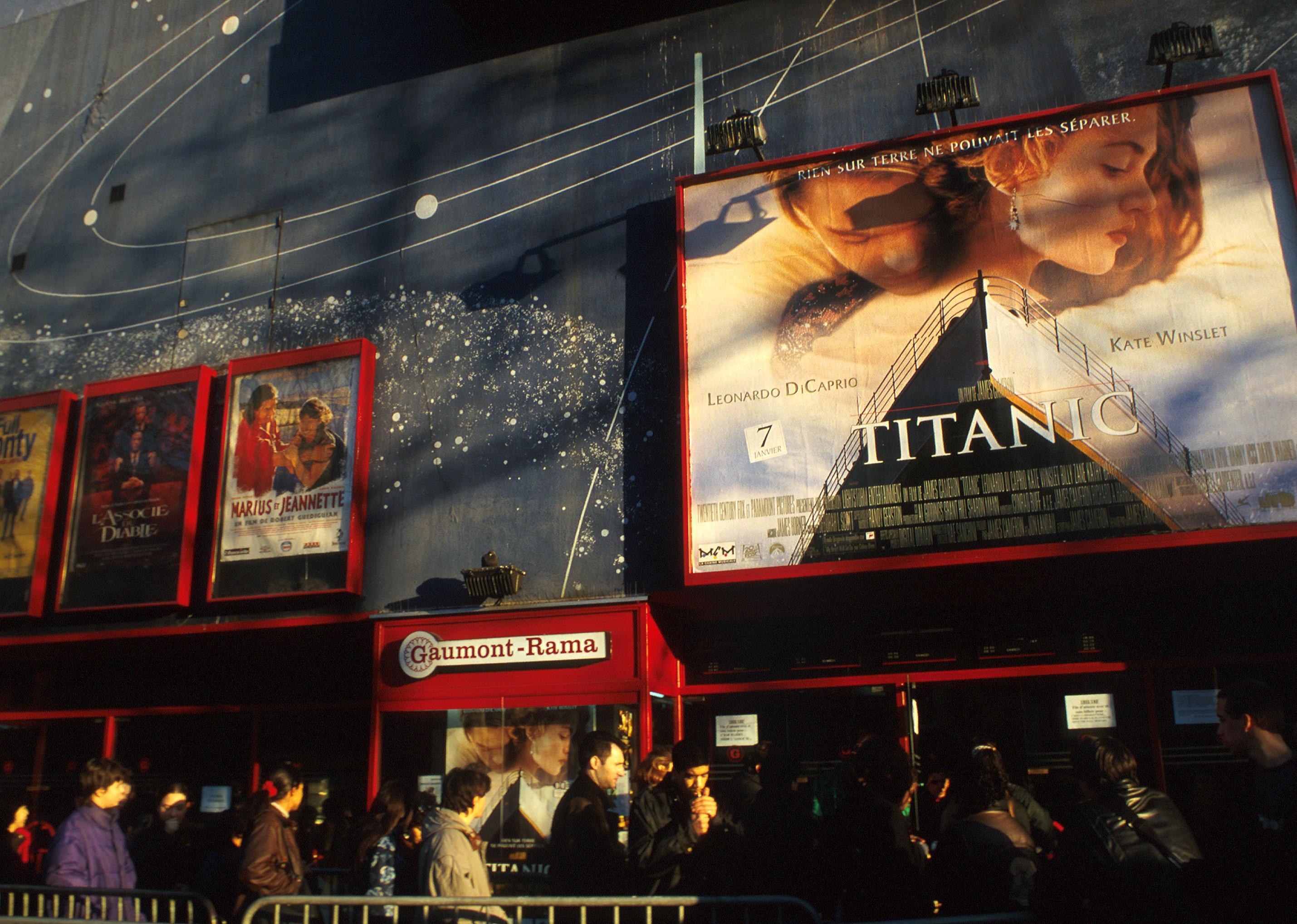 Advertisements for movies outside a theater, including one for Titanic, in 1998.