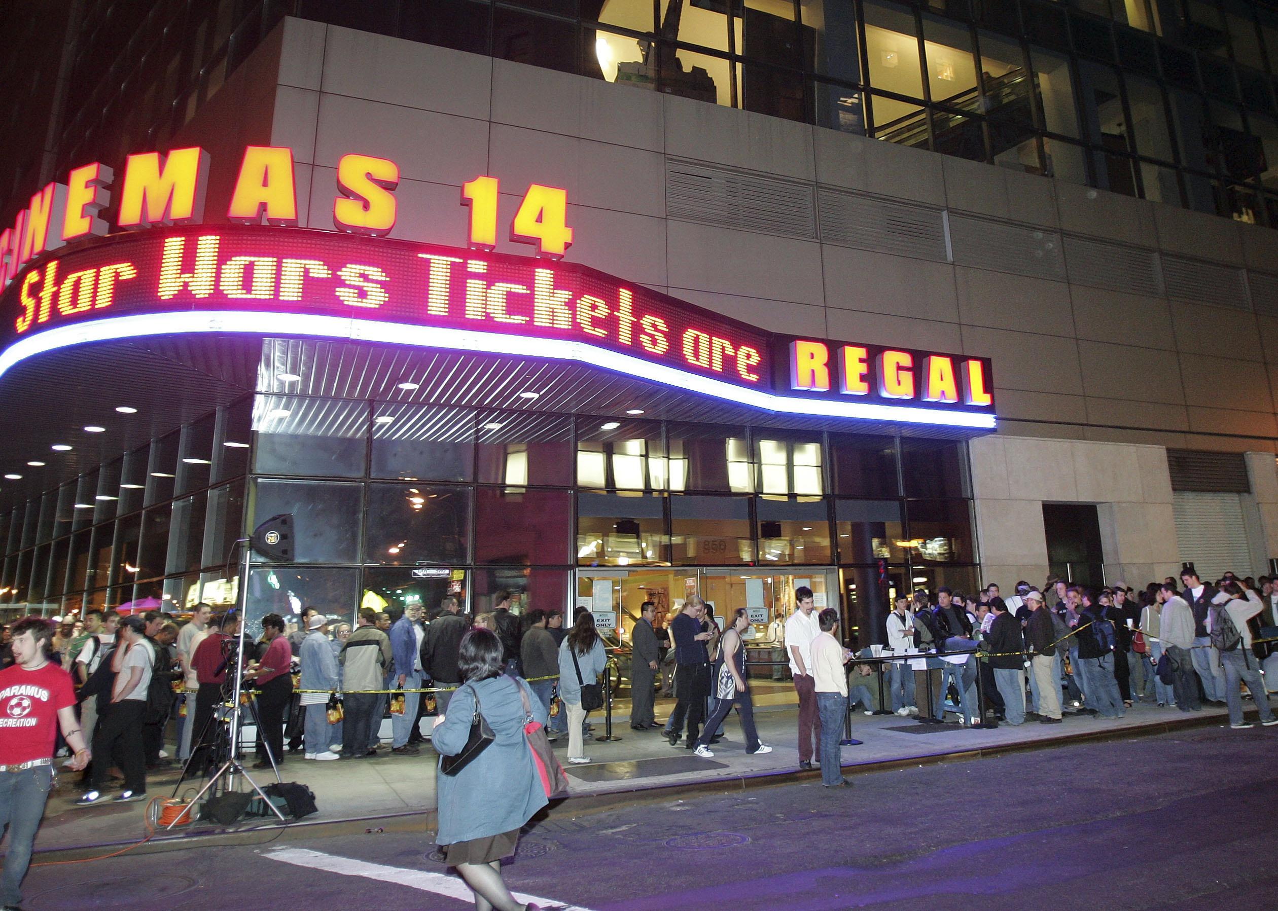Star Wars fans line up around the outside of the theater with neon signs announcing the movie.