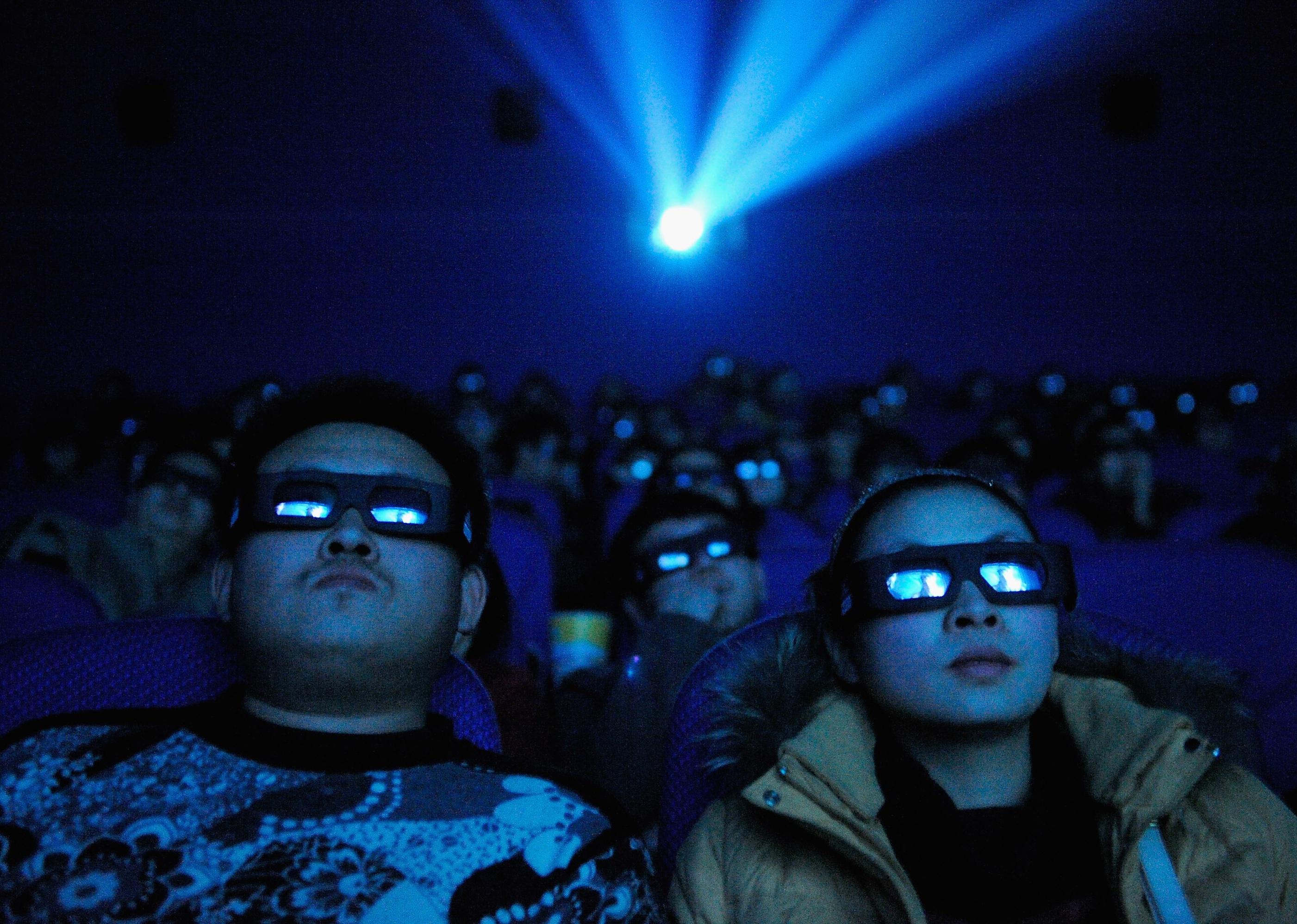 Avatar fans watching the movie with 3D glasses as blue light shines on them from the screen.