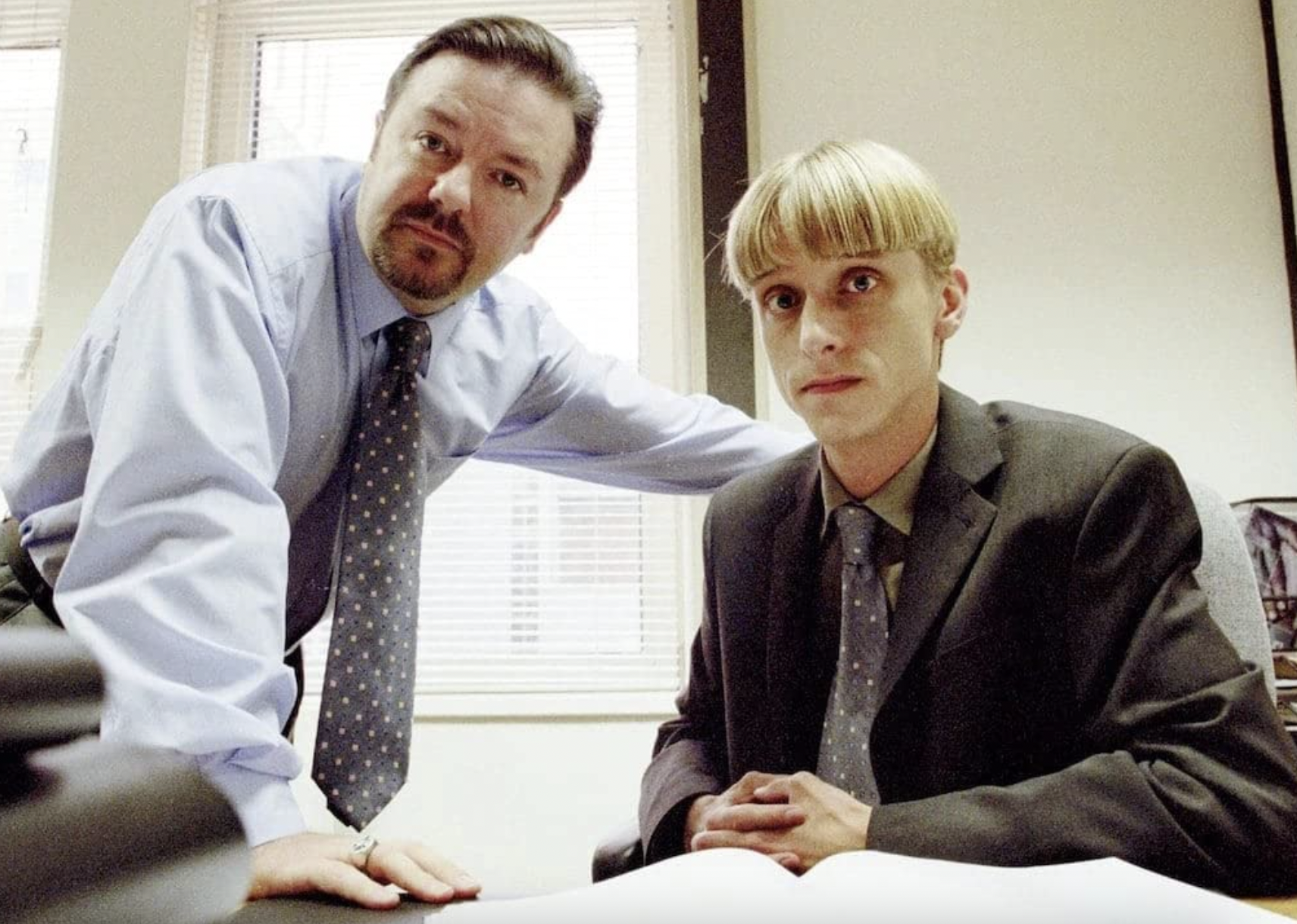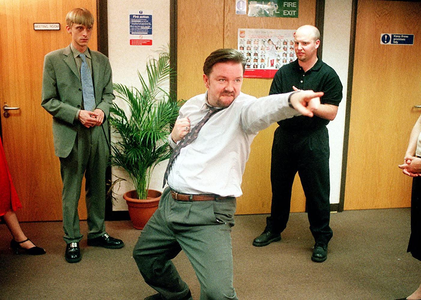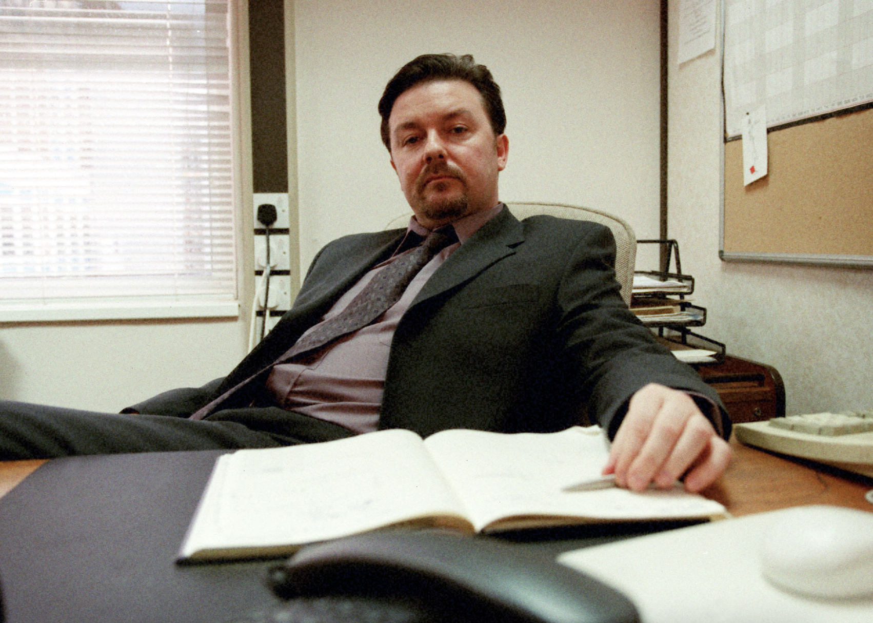 The British mockumentary “The Office” depicts workers in a nondescript town at a nondescript company, where manager David Brent, played by comedian Ricky Gervais, mistakenly considers himself clever, popular, and going places. Fellow office workers entertain themselves with childish behavior, unrequited loves, and worries that the office will be closed down.