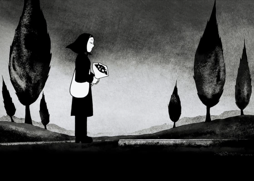 A black and white illustrated frame from ‘It’s Such a Beautiful Day’