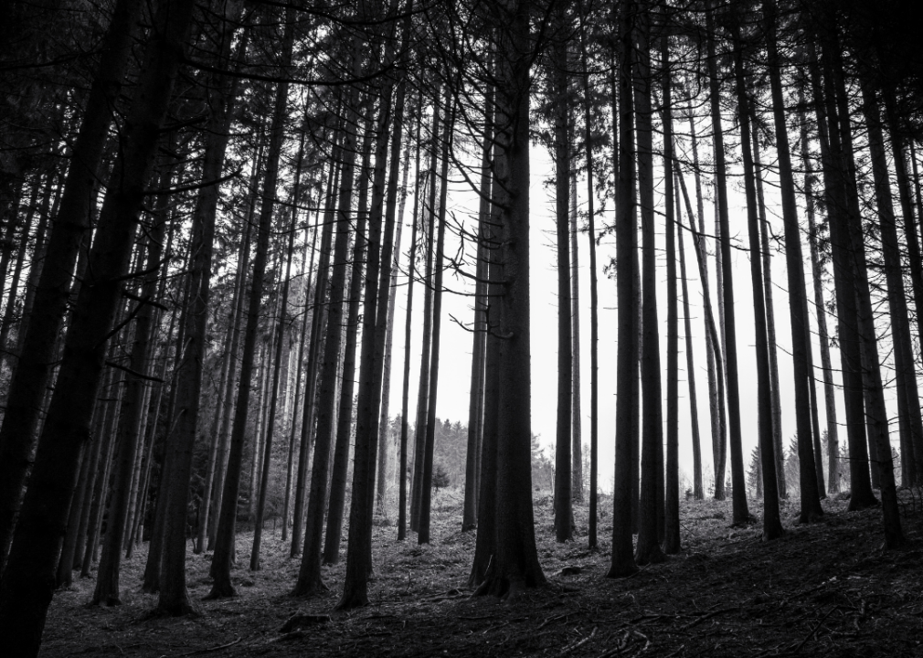 Dark, wooded forest area with minimal light