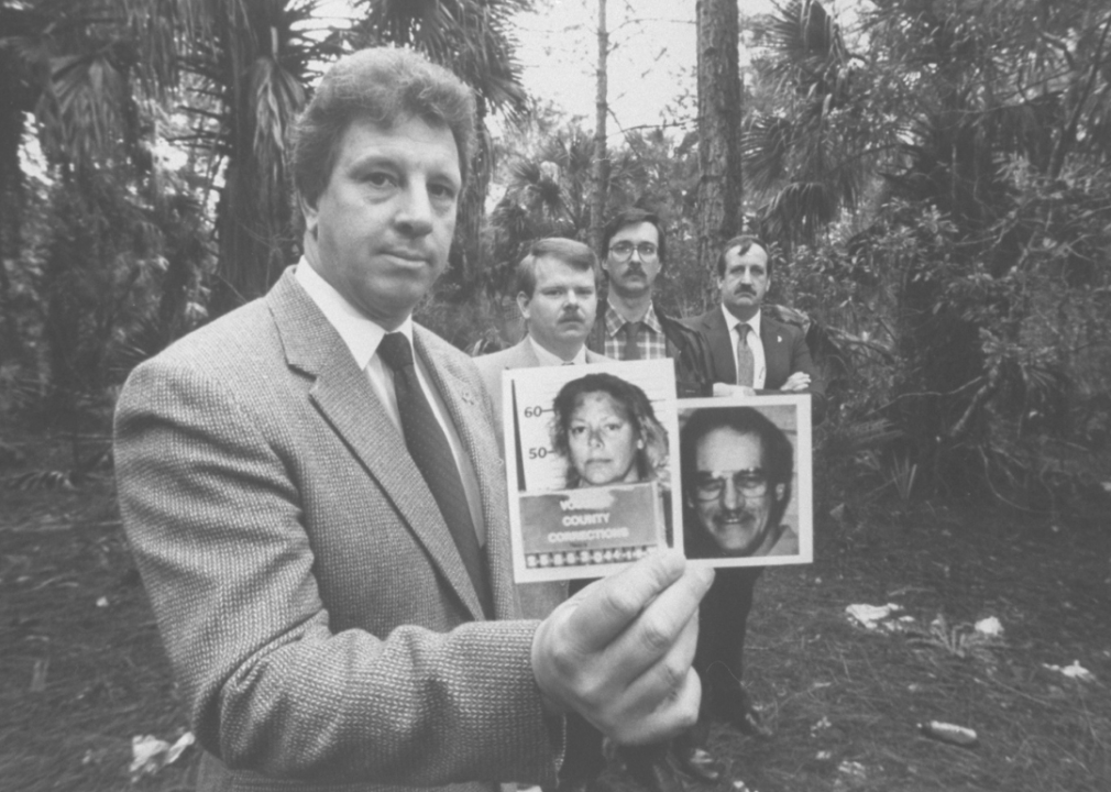 Investigator holds mugshot of murderer Aileen Wuornos and image of victim