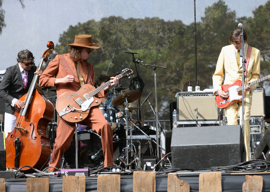 Bass player Sean Dean, guitarist Travis Good, and singer Dallas Good of The Sadies performing onstage at Golden Gate Park on October 3, 2015, in San Francisco, California.